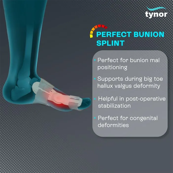 Designed to correct the Hallux Valgus deformity of the big toe. On wearing, the toe is stretched in an overcorrected position, leading to the elongation of soft tissues around the big toe; the mal-positioning is corrected over time. The device can also be worn as a post-operative aid after bunion surgery to stabilize the corrected alignment.