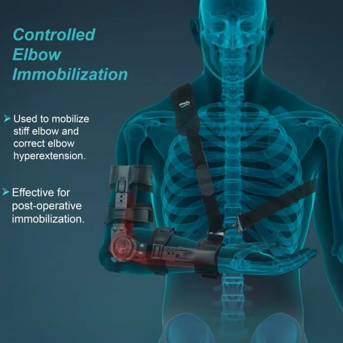 Designed to control and restrict the degree of flexion and extension of the elbow joint through a sophisticated dial system to allow a range of motion or immobilization of the elbow. Universal design allows it to be used on most of the patients and for multiple orthopedic problems. *Use this product under the guidance of a qualified doctor